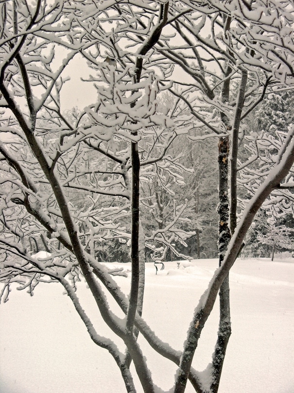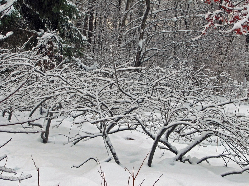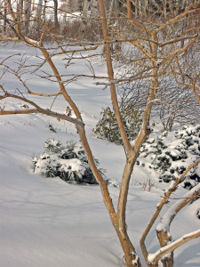 By February the birds have eaten all the fruit on my winterberries (Ilex verticillata) but I still enjoy the shapes of the dark branches against the snow. Every couple of years I spend an afternoon removing the small lower branches to keep the bushes tidy.